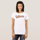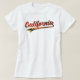 Women's white California T-shirt with sunset and palm trees. This design features the word "California" in a freestyle swash tail font with palm trees and sunset colours fill. You'll love this California T-shirt for men if you love California sunsets.