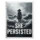 A striking black-and-white wall art print featuring the silhouette of a woman standing strong amid turbulent waves. With her hair blowing in the wind and posture upright, she faces the storm with unwavering resolve. Bold typography beneath her reads: "SHE PERSISTED", symbolizing strength, endurance, and courage in the face of adversity. The dramatic seascape emphasizes the power of inner strength and resilience, making this piece a bold statement for empowerment.