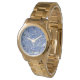 This unique watch is for women. It is gold with a blue psychedelic face. The design comes from a handmade tile. The numbers are easy to read. This is from Oregon Tile maker Fay Jones Day.