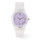 This sporty 80s style watch with durable clear silicone buckle strap and texture-looking lavender face, features calligraphy monogram initials and numbers in a subtle grey. These were called "Jelly watches" in the 80s. Easily change or remove the initials using the Template provided. To edit and change font style, font color, size and more-- use the Design Tool. White and black silicone straps are available along with 15 other styles. See "About" for more information.