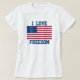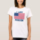 Women's basic t-shirt is shown in white with a patriotic USA Flag print.