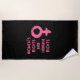 Beach towel with a feminist message, features pink female symbol and "women's rights are human rights" text in brush stroke style font on black background.