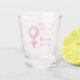 Shot glass with a feminist message, features pink female symbol and "women's rights are human rights" text in brush stroke style font