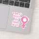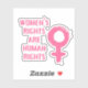 Vinyl sticker with a feminist message, features pink female symbol and "women's rights are human rights" text in brush stroke style font on black background.
