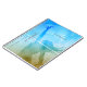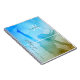 Sporty women's volleyball spiral notebook featuring a conceptual scene from a volleyball game at the beach, with custom text that reads, "sand, surf and sky ... and volleyball" - blended volleyball graphics include a volleyball and silhouetted female volleyball player jumping at a volleyball net superimposed over a turquoise, white and light brown diagonal gradient background that represents a clear blue sky, the ocean surf and a sandy beach - customize with her monogram and name - by katz_d_zynes