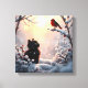 A serene winter landscape with a tiny black kitten and a vibrant red robin against a backdrop of frosty foliage and softly falling snowflakes, evoking a sense of magic and wonder in a cinematic, epic style reminiscent of classic matte paintings and atmospheric digital art.