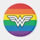 DC Pride | Wonder Woman's iconic logo with layers of rainbow colours inside it.