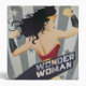 Wonder Woman in side profile, flexing her muscles, as she leaps forward. In the background you can see the tall city buildings and skyscrapers, against a retro sunburst sky decorated with stars.