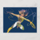 Classic Wonder Woman character art jumping to attack with her lasso overlaid ontop of a waterfall at sunset, surrounded by yellow flowers.