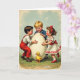 This design shows three children gathered closely around an oversized cream-colored egg on a green lawn, their faces turned toward one another with the kind of tender, shared excitement that feels like close friendship. A fair-haired boy in a sailor outfit smiles as he rests both hands on the egg’s smooth surface, while a dark-haired boy in red overalls leans in with rosy cheeks, watching the other boy’s touch like he’s in on a secret. Across from them, a girl in a white dress with red floral stitching reaches out, her matching hair bow tilted as she extends her fingers toward the egg, as if inviting the others to look with her. Near the bottom, a tiny yellow chick with orange feet stands by the egg and looks up, adding a sweet, gentle note 🐇. The setting includes small pink flowers scattered through the grass and a little puddle that catches pale sky tones, giving the scene a soft, storybook look 🌷. There is no wording shown on the front, leaving open space above the children and egg where text could be placed in a light gray or soft red. Behind them, the sky is pale blue with scattered white clouds, and the egg’s curved surface reflects a faint highlight.