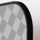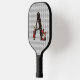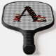 Whimsical pickleball paddle design features vintage Alice and the Queen of Hearts colour illustrations with large letter / initial 'A' with a card suite fill on muted grey harlequin background.