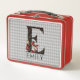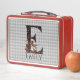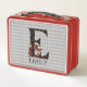 Whimsical Wonderland themed custom lunchbox features vintage Alice and the Queen of Hearts character colour illustrations with large letter / initial E with a black/gold/red card suites fill pattern on a vintage grey harlequin background. Personalize further with customizable name text