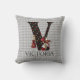 Whimsical Wonderland themed throw pillow features vintage Alice and the Queen of Hearts character colour illustrations with large letter / initial V with a black/gold/red card suites fill pattern on a vintage grey harlequin background. Personalize further with customizable name text