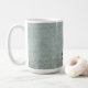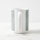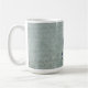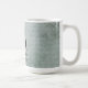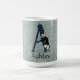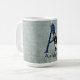 Whimsical drinkware design for Alice in Wonderland lovers of all ages features capital letter / initial A with black and blue harlequin fill and original White Rabbit illustration that has been tinted, on a distressed vintage floral and handwriting blue tinted background. Personalize with name or other message