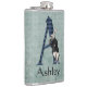 Whimsical drinkware design for Alice in Wonderland lovers of all ages features capital letter / initial A with black and blue harlequin fill and original White Rabbit illustration that has been tinted, on a distressed vintage floral and handwriting blue tinted background. Personalize with name or other message