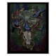 Three Grackles perched in the antlers of an old deer skull, in wonderment at a glistening spiders web, beautiful artwork inspired by natures cycles. no ai used original artwork by Erin Cooper