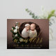 Elegany holiday birth announcement for twins features a single full bleed horizontal or landscape oriented photo with "wonders of his love" overlaid in luxe gold foil script and block lettering. Personalize with the babies' names or a custom message beneath. Cards reverse to a botanical patterned background with your twins' birth stats and additional info. A beautiful choice to celebrate the arrival of your Christmas season twin babies.