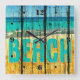 Beach sign in a weathered wood look with blue green water beyond the sandy beach. Fun beach decor.