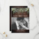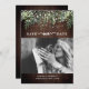 Botanical greenery string lights design at top over wood background. Personalize with your own save the date photo.