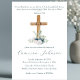 This elegant, floral custom baptism invitation features a religious watercolor image in the centre. A wood cross is accented with white and blue flowers, and delicate greenery. A sample bible verse for baptism is printed above the wooden cross.