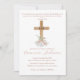 This elegant, floral custom baptism invitation features a religious watercolor image in the centre. A wood cross is accented with white and blush coloured flowers, and delicate greenery. A sample bible verse for baptism is printed above the wooden cross.