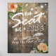 Pick A Seat Not A Side Wedding Sign Poster - Elegant Script with Peach White Roses Floral and String Lights on Rustic Wood Background.