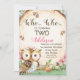 Cute girl's owl themed second birthday invitation featuring an owl with a floral crown, a bird and wood slice. This design can also be used for a different age.