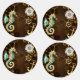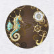 Brown wooden background with sea, mechanical ridge, an antique steering wheel, golden anchor and various gold and brass gears. Steampunk style.
