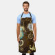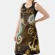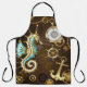 Brown wooden background with sea, mechanical ridge, an antique steering wheel, golden anchor and various gold and brass gears. Steampunk style.