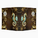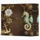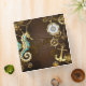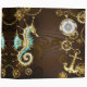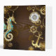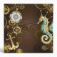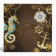 Brown wooden background with sea, mechanical ridge, an antique steering wheel, golden anchor and various gold and brass gears. Steampunk style.