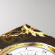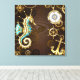 Brown wooden background with sea, mechanical ridge, an antique steering wheel, golden anchor and various gold and brass gears. Steampunk style.
