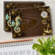 Brown wooden background with sea, mechanical ridge, an antique steering wheel, golden anchor and various gold and brass gears. Steampunk style.