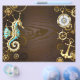 Brown wooden background with sea, mechanical ridge, an antique steering wheel, golden anchor and various gold and brass gears. Steampunk style.