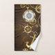 Brown wooden background with sea, mechanical ridge, an antique steering wheel, golden anchor and various gold and brass gears. Steampunk style.