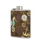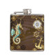 Brown wooden background with sea, mechanical ridge, an antique steering wheel, golden anchor and various gold and brass gears. Steampunk style.