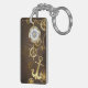 Brown wooden background with sea, mechanical ridge, an antique steering wheel, golden anchor and various gold and brass gears. Steampunk style.