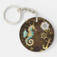 Brown wooden background with sea, mechanical ridge, an antique steering wheel, golden anchor and various gold and brass gears. Steampunk style.