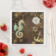 Brown wooden background with sea, mechanical ridge, an antique steering wheel, golden anchor and various gold and brass gears. Steampunk style.