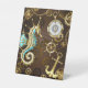 Wooden Background with Mechanical Seahorse Pedestal Sign
