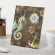 Brown wooden background with sea, mechanical ridge, an antique steering wheel, golden anchor and various gold and brass gears. Steampunk style.