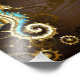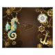 Brown wooden background with sea, mechanical ridge, an antique steering wheel, golden anchor and various gold and brass gears. Steampunk style.