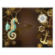 Brown wooden background with sea, mechanical ridge, an antique steering wheel, golden anchor and various gold and brass gears. Steampunk style.