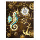 Brown wooden background with sea, mechanical ridge, an antique steering wheel, golden anchor and various gold and brass gears. Steampunk style.