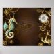 Brown wooden background with sea, mechanical ridge, an antique steering wheel, golden anchor and various gold and brass gears. Steampunk style.