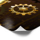 Brown wooden background with sea, mechanical ridge, an antique steering wheel, golden anchor and various gold and brass gears. Steampunk style.