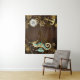 Brown wooden background with sea, mechanical ridge, an antique steering wheel, golden anchor and various gold and brass gears. Steampunk style.