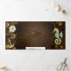 Brown wooden background with sea, mechanical ridge, an antique steering wheel, golden anchor and various gold and brass gears. Steampunk style.