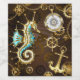 Brown wooden background with sea, mechanical ridge, an antique steering wheel, golden anchor and various gold and brass gears. Steampunk style.