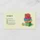 A business card with a soft pastel yellow background for a toy maker or a toy store featuring a stack of brightly coloured wooden toy blocks in a hand-drawn feel. The blocks are arranged in a whimsical tower with a single red block positioned on top, displaying a customizable text, and a single, stylized star sits near the bottom corner. It could be used by a handcrafted making wooden toys, construction or educational games, etc.