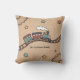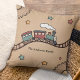 A pillow featuring an illustration of a smiling wooden train chugging along a winding track. The card background is a warm, gradient textured beige with subtle details like wooden gears and hand-drawn stars. A nice gift idea for a family or a kid!